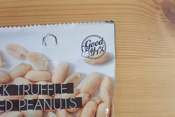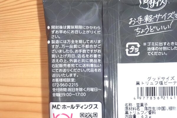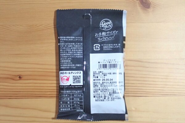 「Goodサイズ」です。もしかしたら、他にも「Goodサイズ」シリーズがあるのかもしれませんね。ちなみに商品名は「グッドサイズ 黒トリュフ塩ピーナッツ」です。