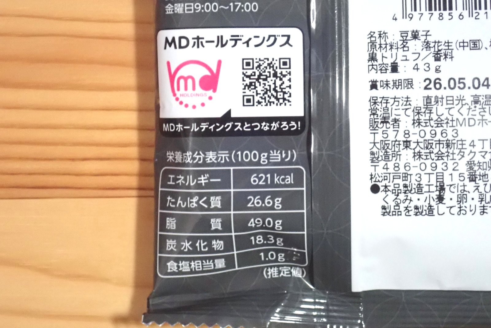 - 材質等:落花生(中国)、植物油、食塩、黒トリュフ/香料