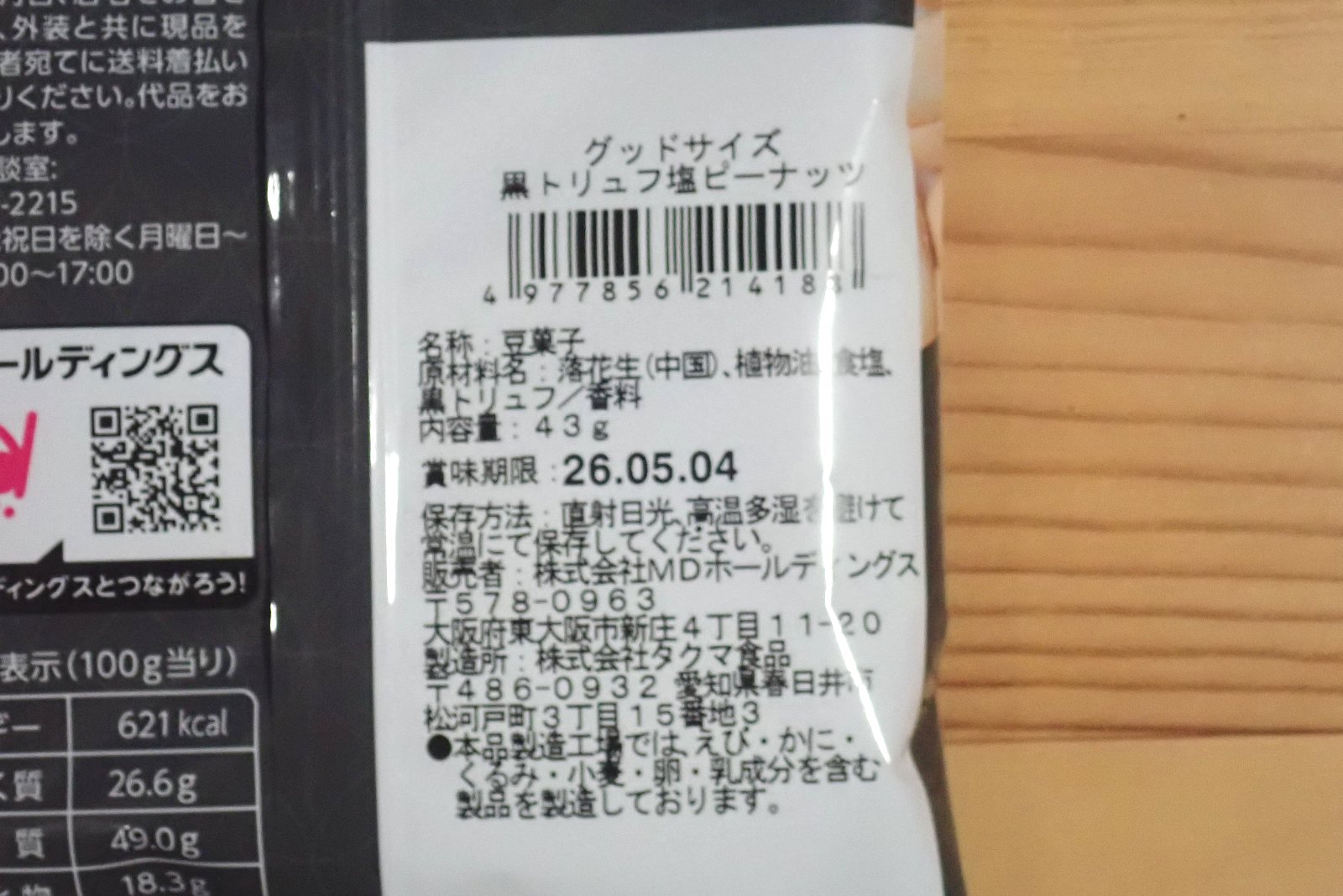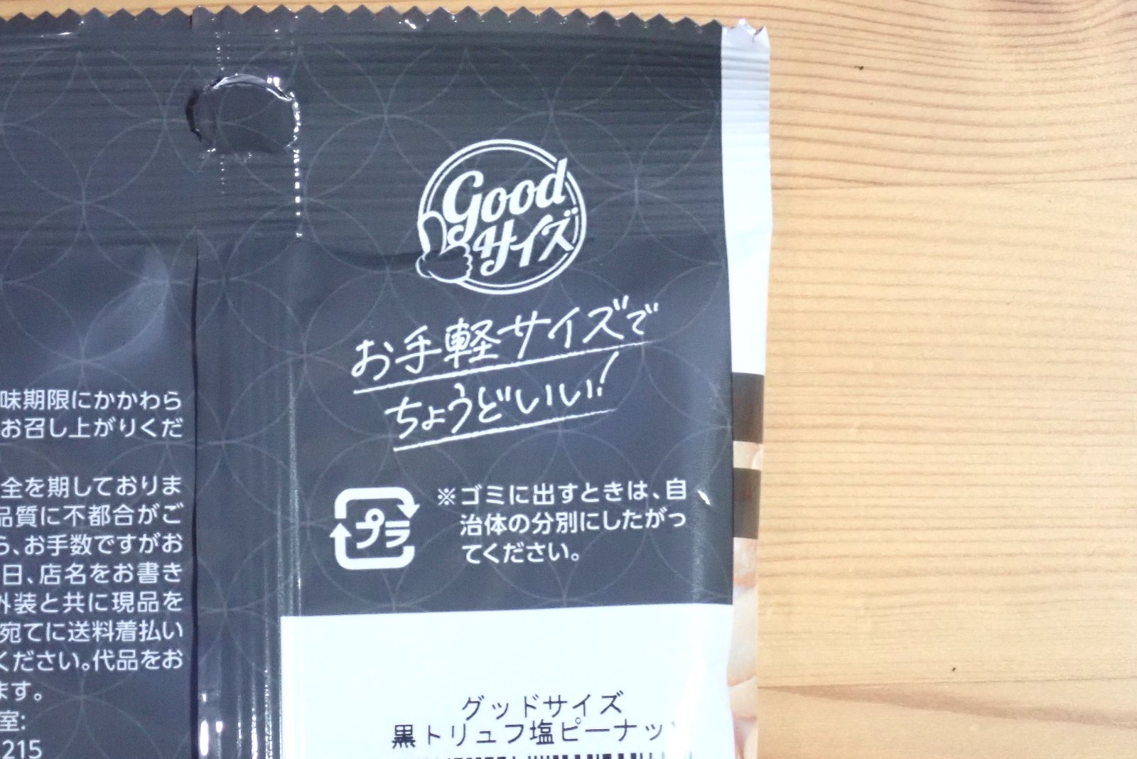 「Goodサイズ」です。もしかしたら、他にも「Goodサイズ」シリーズがあるのかもしれませんね。ちなみに商品名は「グッドサイズ 黒トリュフ塩ピーナッツ」です。