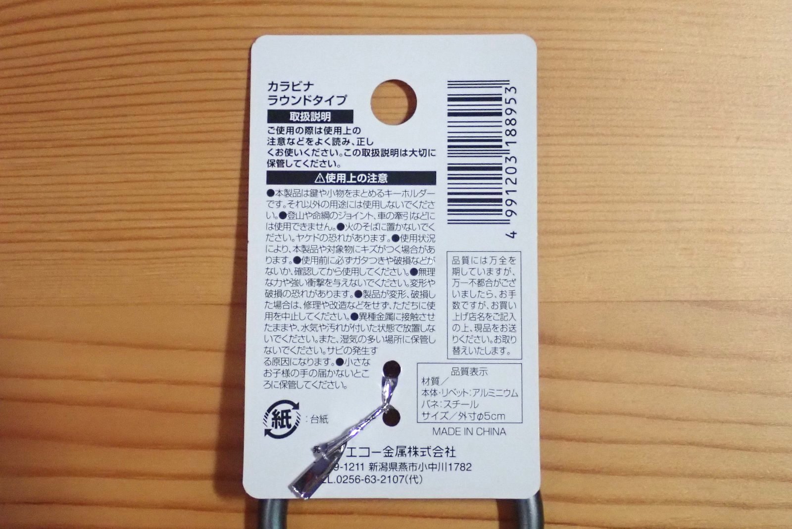 続いて、パッケージ裏側です。カラビナは、針金(ビニタイと言ったらいいんでしょうか)で台紙に固定されています。