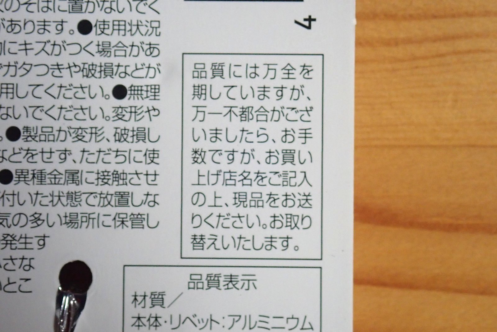 - 材質等:本体・リベット、アルミニウム。バネ・スチール
