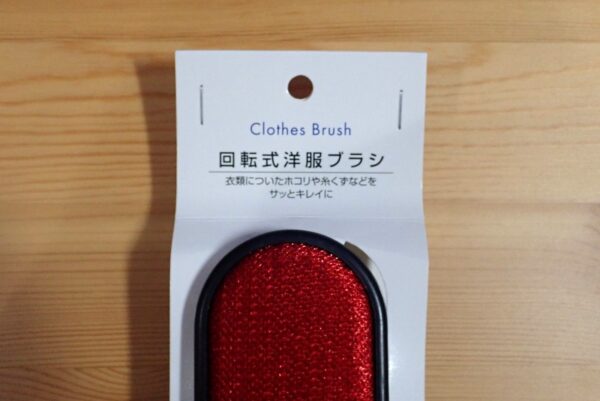 セリアでは、このように、回転式洋服ブラシが台紙にはさまったような状態で陳列されています。余談ですが、このままの状態でも、ボタン操作をすることでブラシ部分を回転させることができます。