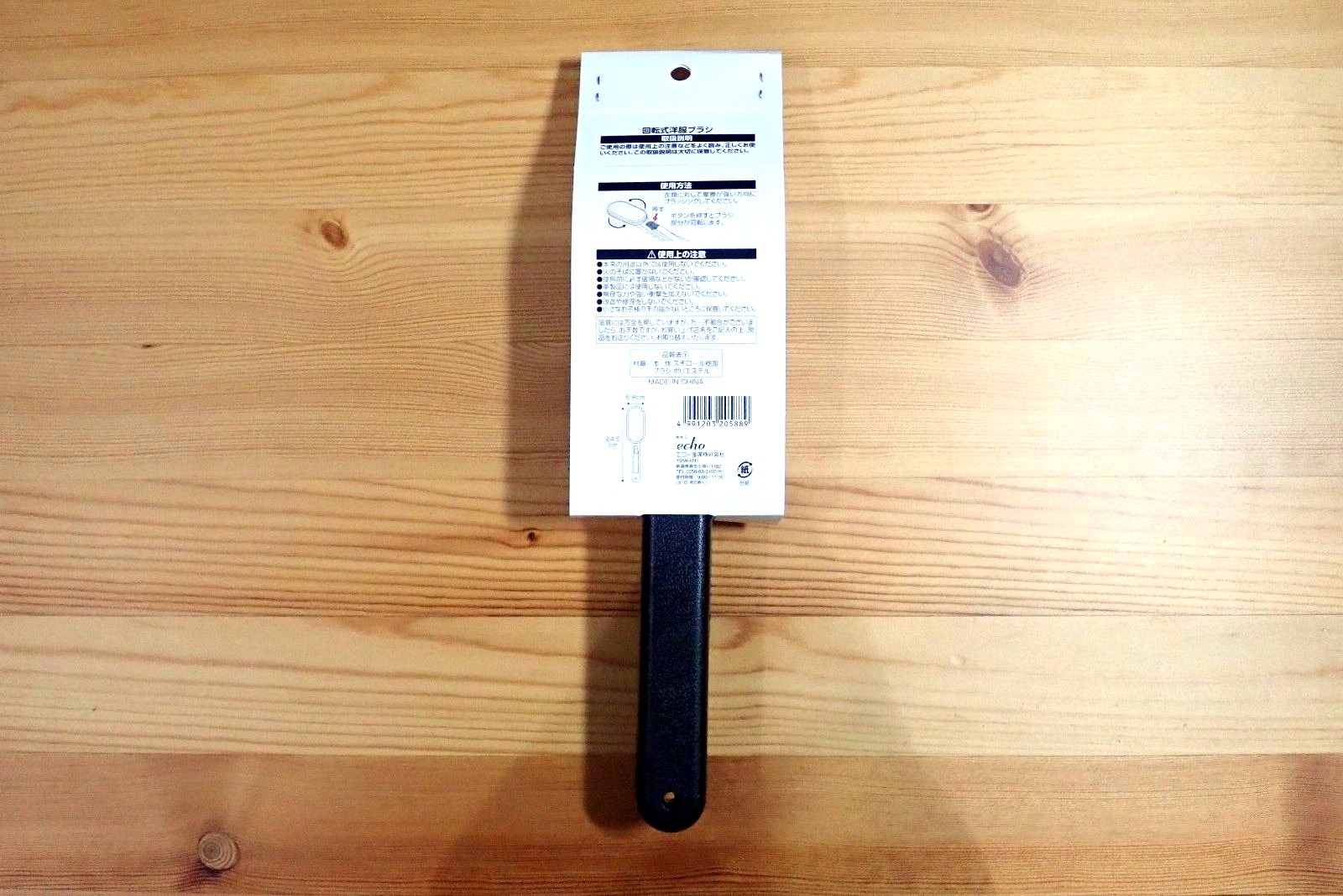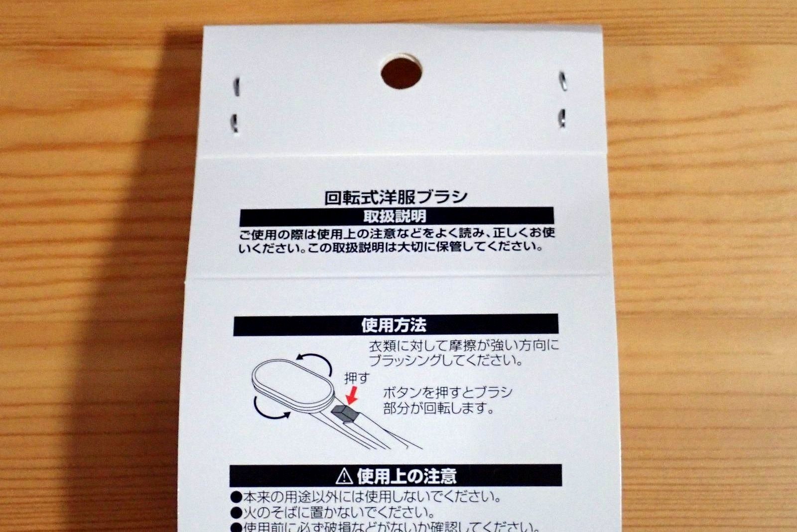 セリアでは、このように、回転式洋服ブラシが台紙にはさまったような状態で陳列されています。余談ですが、このままの状態でも、ボタン操作をすることでブラシ部分を回転させることができます。