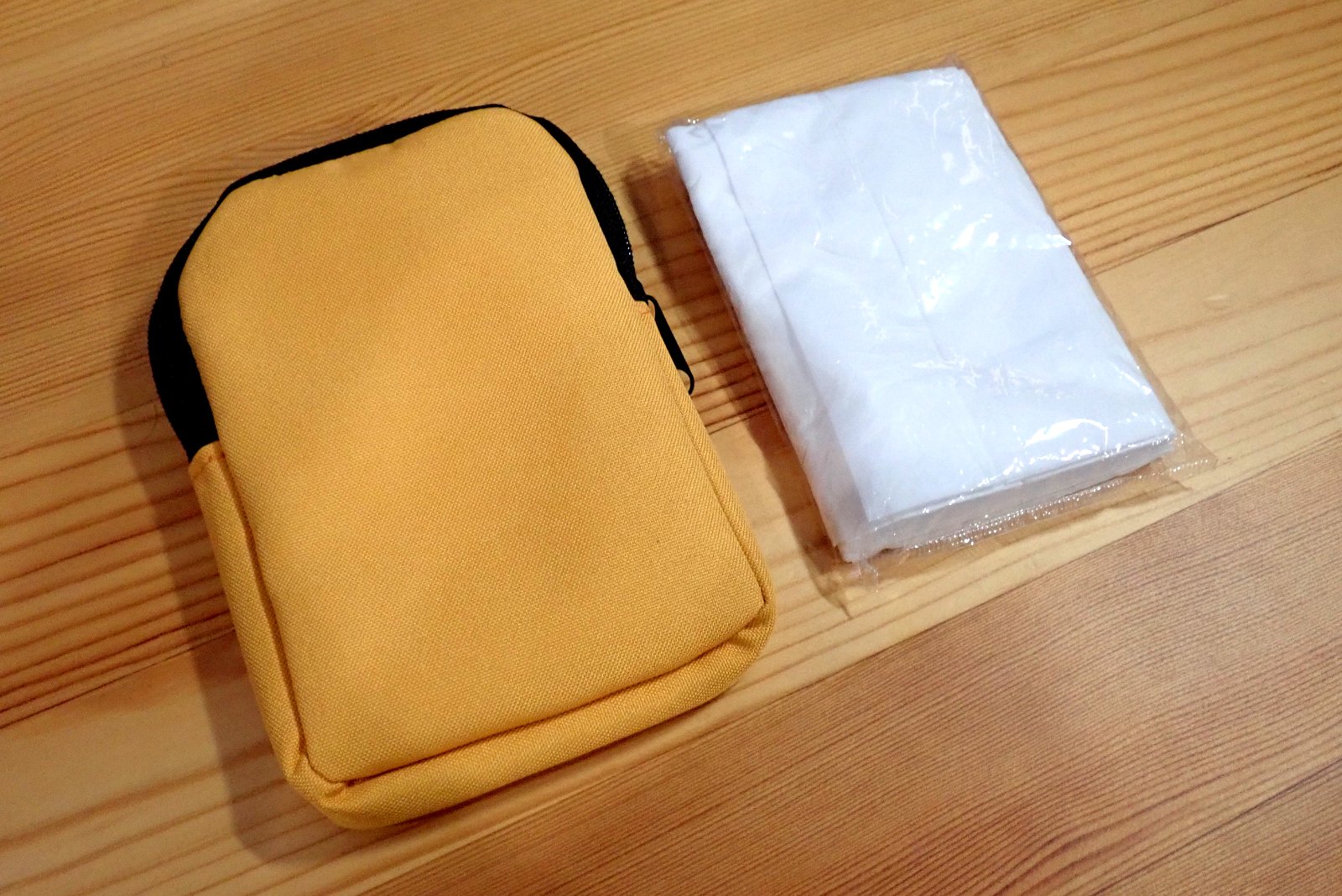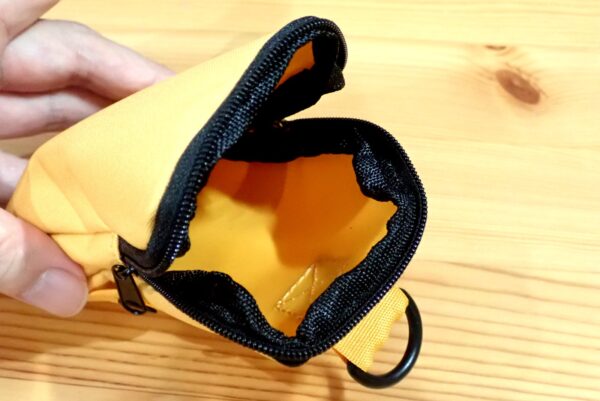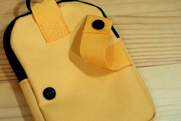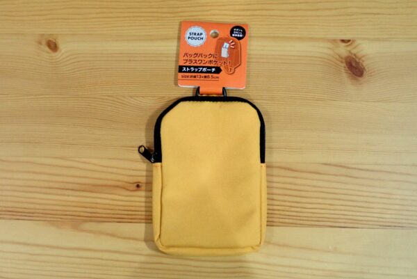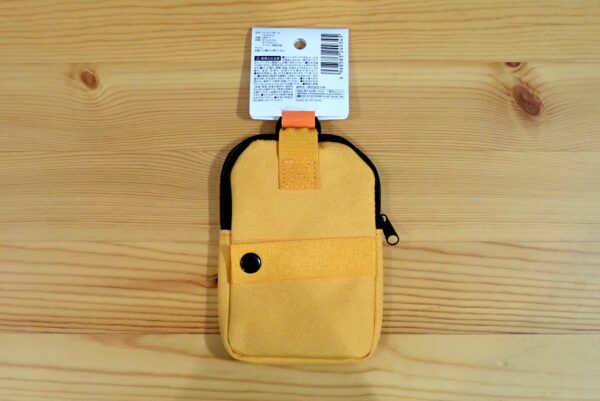 割と普通にアウトドア用品として売っていそうな、ベーシックなデザインのストラップポーチです。色は、イエロー以外にも何色かあります。