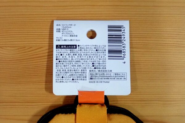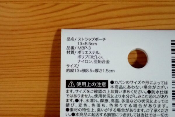 品名、「ストラップポーチ」って書くんですね。そういえば、カップ麺なんかも、品名は「即席カップめん」って書いてあったりします。何か、表記ルールがあるんでしょうか。サイズ、品番、材質など、しっかり記載されています。
