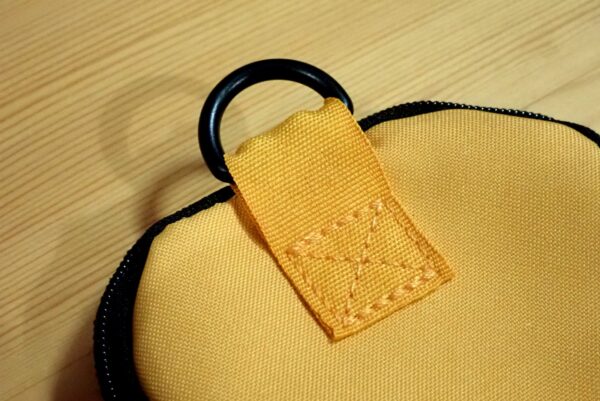 ストラップポーチの裏側です。「Dカン」というのは、アルファベットの「D」と似た形状のリングのことです。カラビナとは違い、開閉機構は付いていません。合わせてカラビナを購入すると良いかもです。